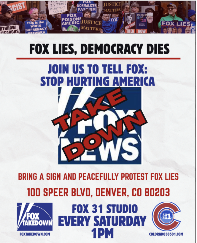 - Every Saturday at 1 - 2pm: FOX News Takedown, 100 Speer Blvd, Denver, CO 80203, USA