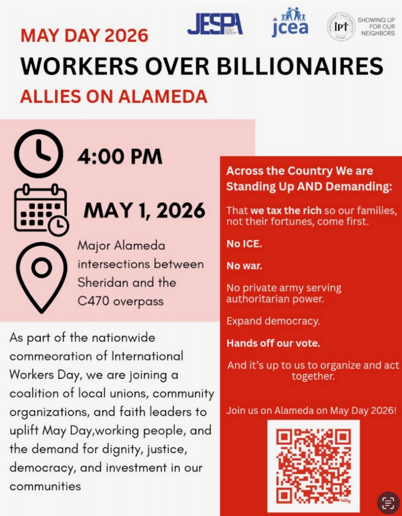 5/1, Friday at 4pm - May Day Hands Across Alameda - Indivisible Lakewood participating along Alameda at Wads intersection (flyer below)